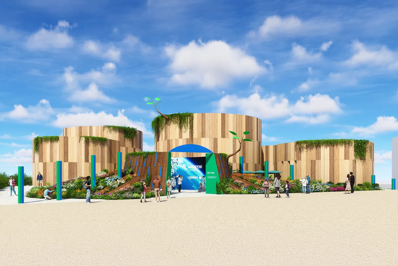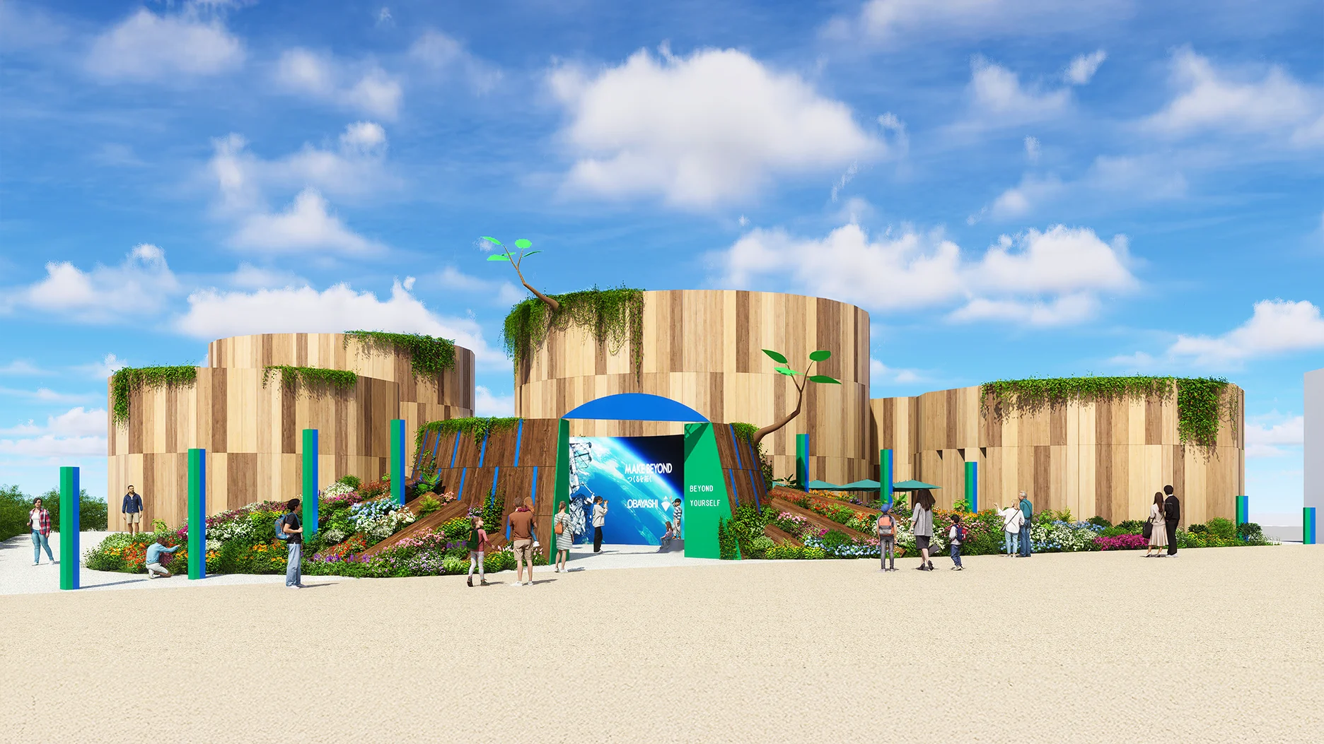 Exterior rendering of OBAYASHI MORI SORA MIRAI, composed of multiple cylindrical buildings linked in a series, inspired by the motif of a "tree stump."